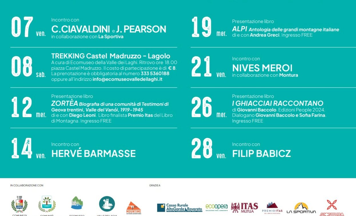 Ad eccezione del trekking, tutti gli eventi si terranno alle ore 20.30 al Teatro Valle dei Laghi.