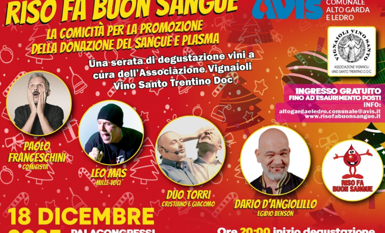 "Riso fa buon sangue” è una serata di comicità dedicata alla promozione della donazione di sangue e plasma, organizzata da AVIS Alto Garda e Ledro. L’evento si terrà il 18 dicembre 2025 al Palacongressi di Riva del Garda.