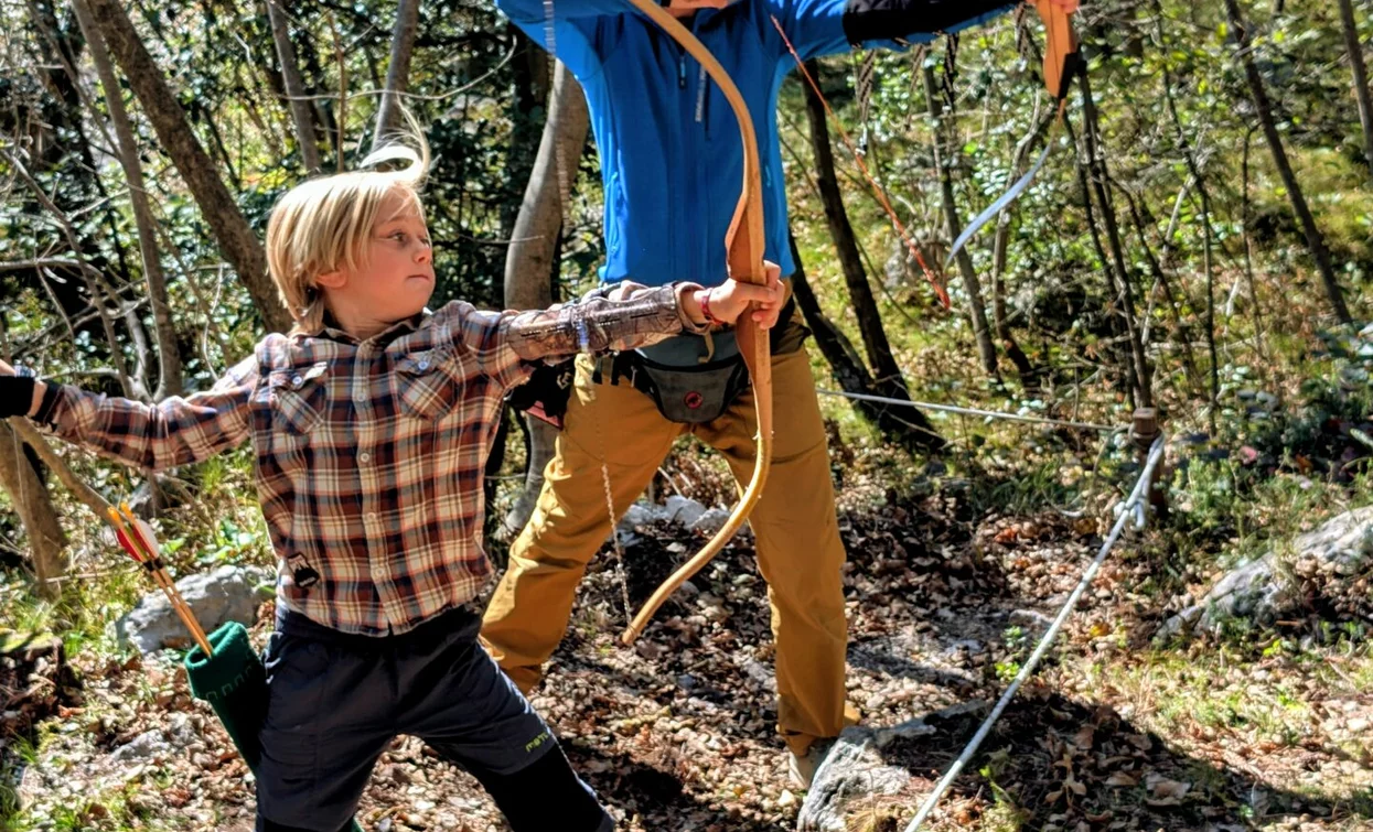 Percorso di tiro primitivo con l’arco nel bosco adatto a famiglie e principianti.